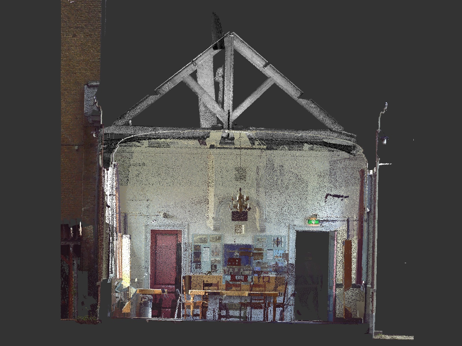 Om de situatie nauwkeurig te analyseren en een onderbouwde herstelstrategie te kunnen ontwikkelen, werd besloten het volledige gebouw in te meten met een 3D-laserscanner.