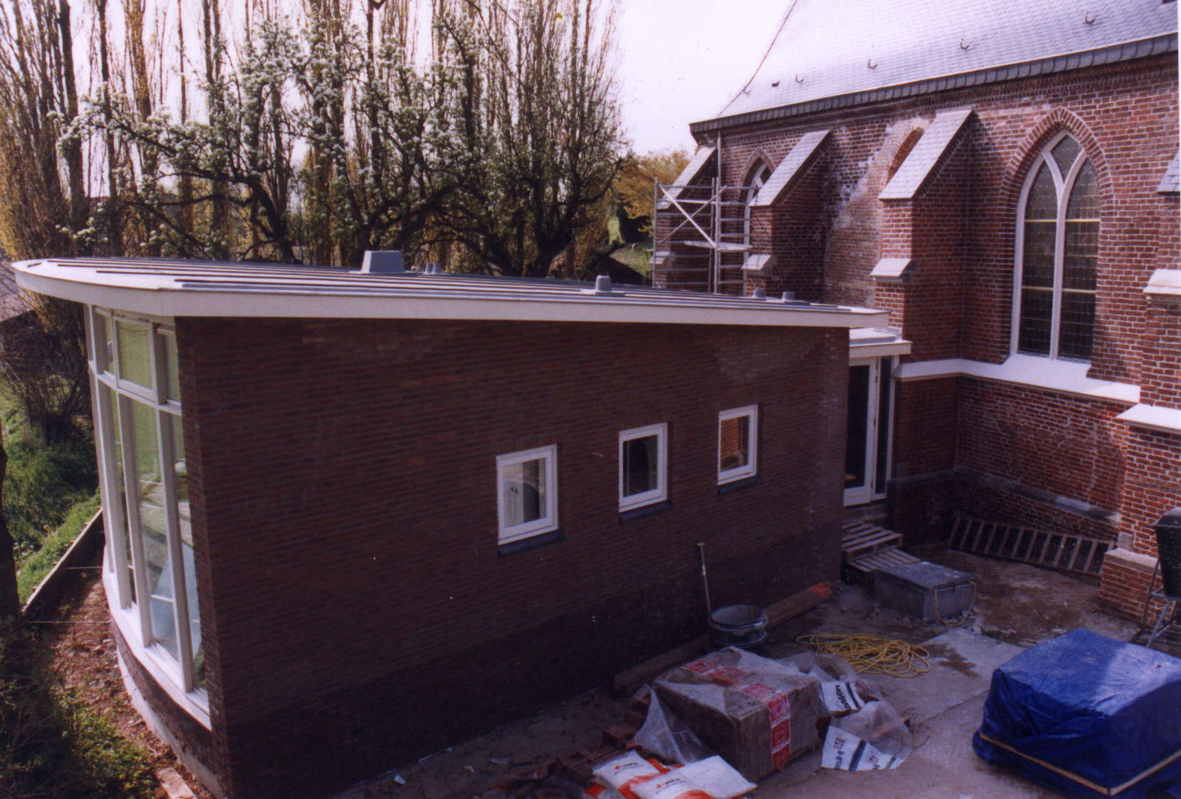 Naast de centrale ruimte bevat de uitbreiding ook praktische voorzieningen zoals een keuken, bar en toiletgroep, waarmee het comfort en de gebruiksmogelijkheden aanzienlijk zijn vergroot. Het ontwerp is zorgvuldig afgestemd op de schaal, stijl en sfeer van het oorspronkelijke kerkje, zodat het geheel een harmonieuze eenheid vormt tussen oud en nieuw.