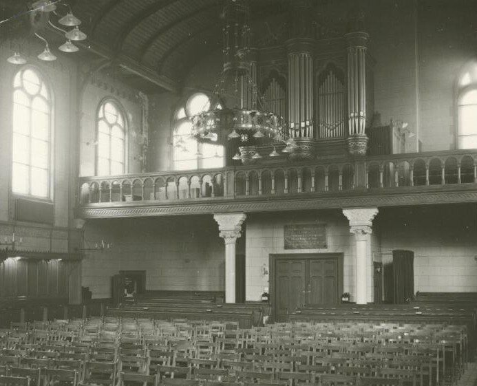 Hieronder de grote zaal in de Doopsgezinde kerk in Den Haag in 1885, vergeleken met de modernisering die plaatsvond in 1964 – het interieur tot de restauratie onder leiding van VIS Architecten plaatsvond.