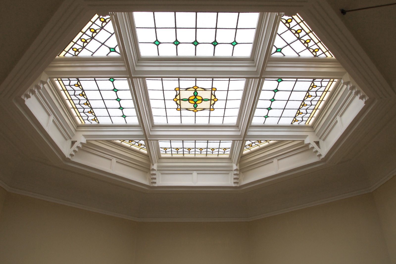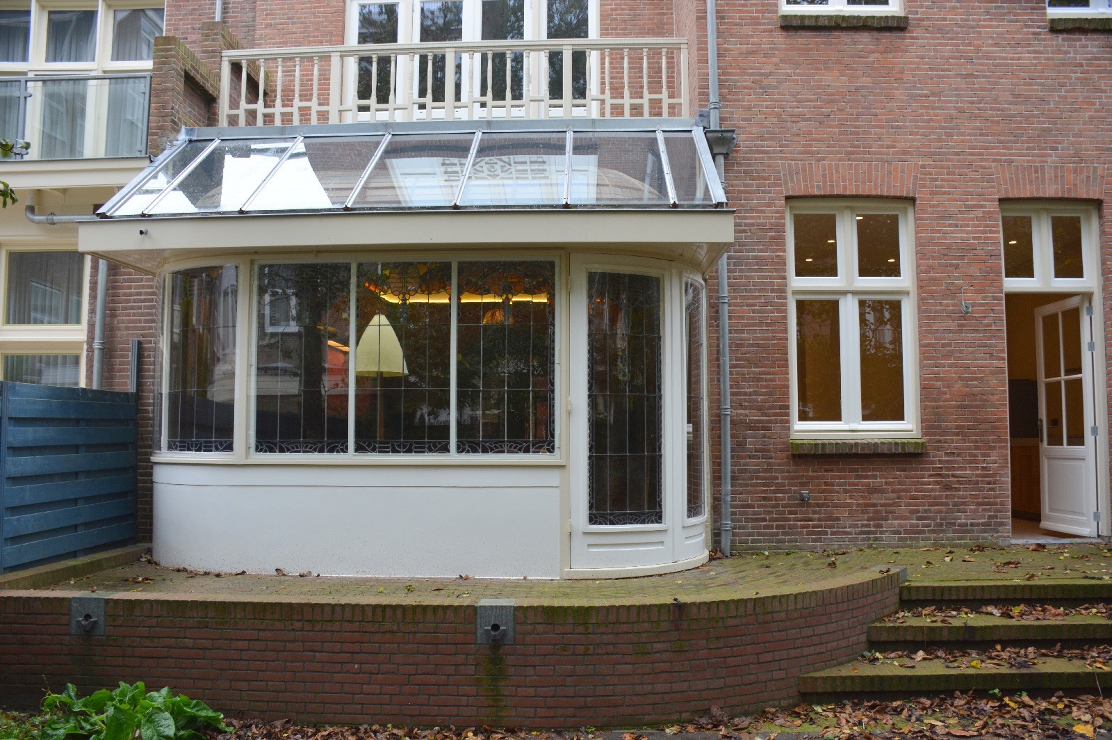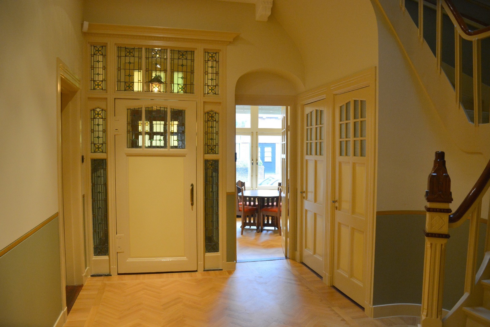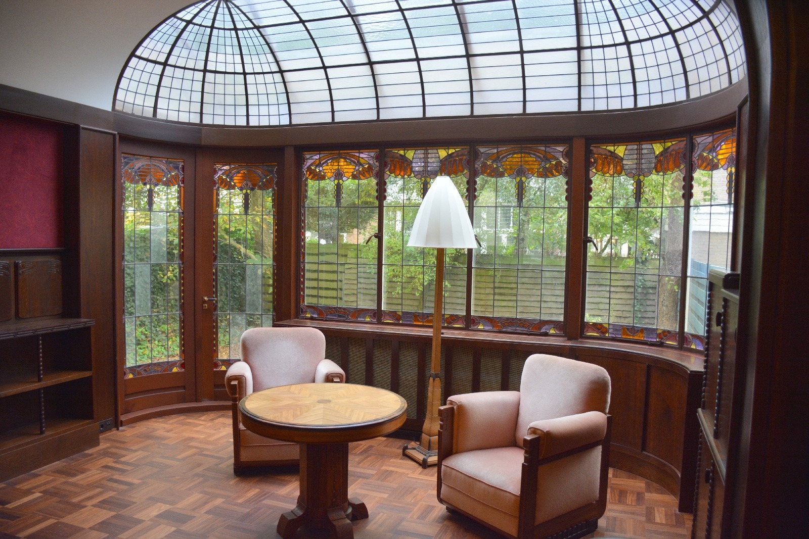 De grotere uitdaging lag in de reconstructie van de achterkamer, waarvan enkel een deur met omlijsting en een afgeronde serre met gebrandschilderd glas bewaard waren gebleven. Dankzij circa twintig historische interieurfoto’s kon een nauwkeurige reconstructie worden gemaakt. Elke foto gaf unieke aanwijzingen over de afwerking, inrichting en details van de kamer. Het oorspronkelijke ontwerp was van architect Napoleon Le Grand, bekend om zijn verfijnde detaillering en harmonieuze interieurontwerpen binnen de Amsterdamse Schoolstijl. De reconstructie werd verder verrijkt met de vondst van een kist vol originele glas-in-loodpanelen, afkomstig van de ronde tuindeur en het tochtportaal. In samenwerking met gespecialiseerde restaurateurs en ambachtslieden is het interieur met uiterste zorgvuldigheid hersteld.