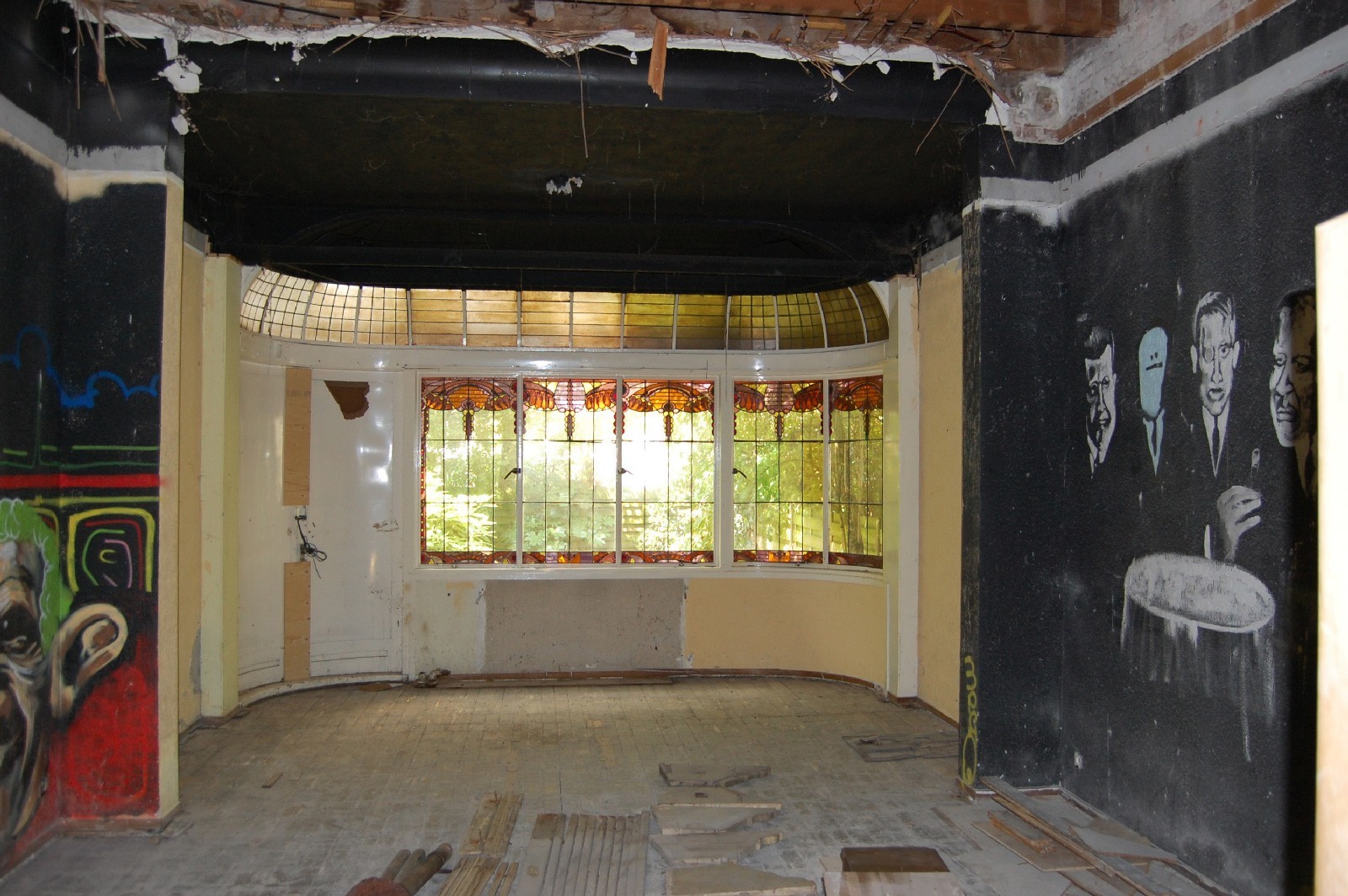 Hieronder een vergelijking van de achterkamer van de woning voor en na de restauratie, met typerende elementen van de Amsterdamse School stijl zoals het glas in lood en sierlijke details.