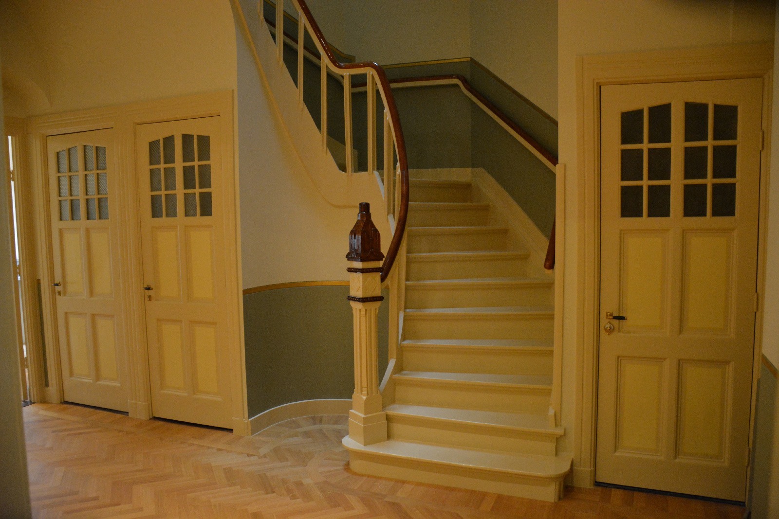 De restauratie richtte zich in eerste instantie op de voorkamer, waar vrijwel alle originele elementen uit 1924 nog aanwezig waren. Vis Architecten heeft de complete kamer gerestaureerd met behoud van de kenmerkende betimmering, wandbespanning, rolluiken en de originele parketvloer. Op basis van zorgvuldig kleurhistorisch onderzoek zijn de oorspronkelijke kleuren nauwkeurig gereconstrueerd.