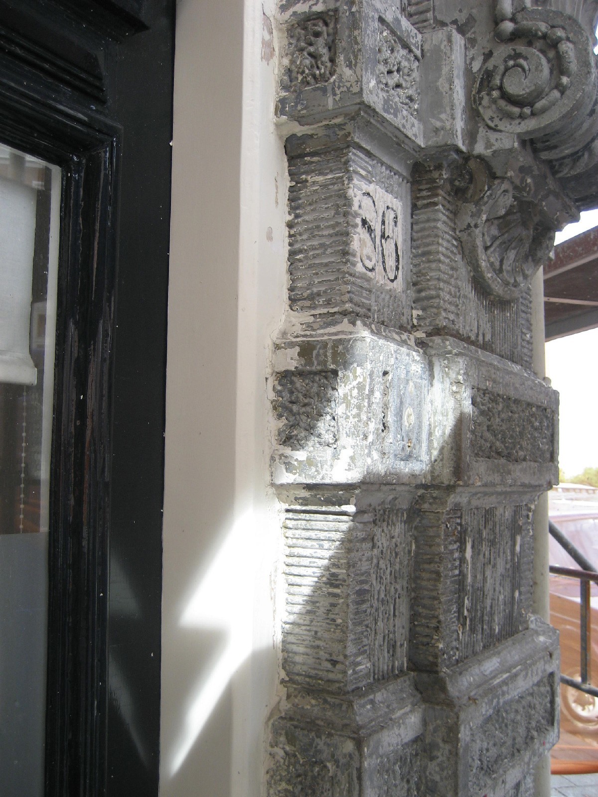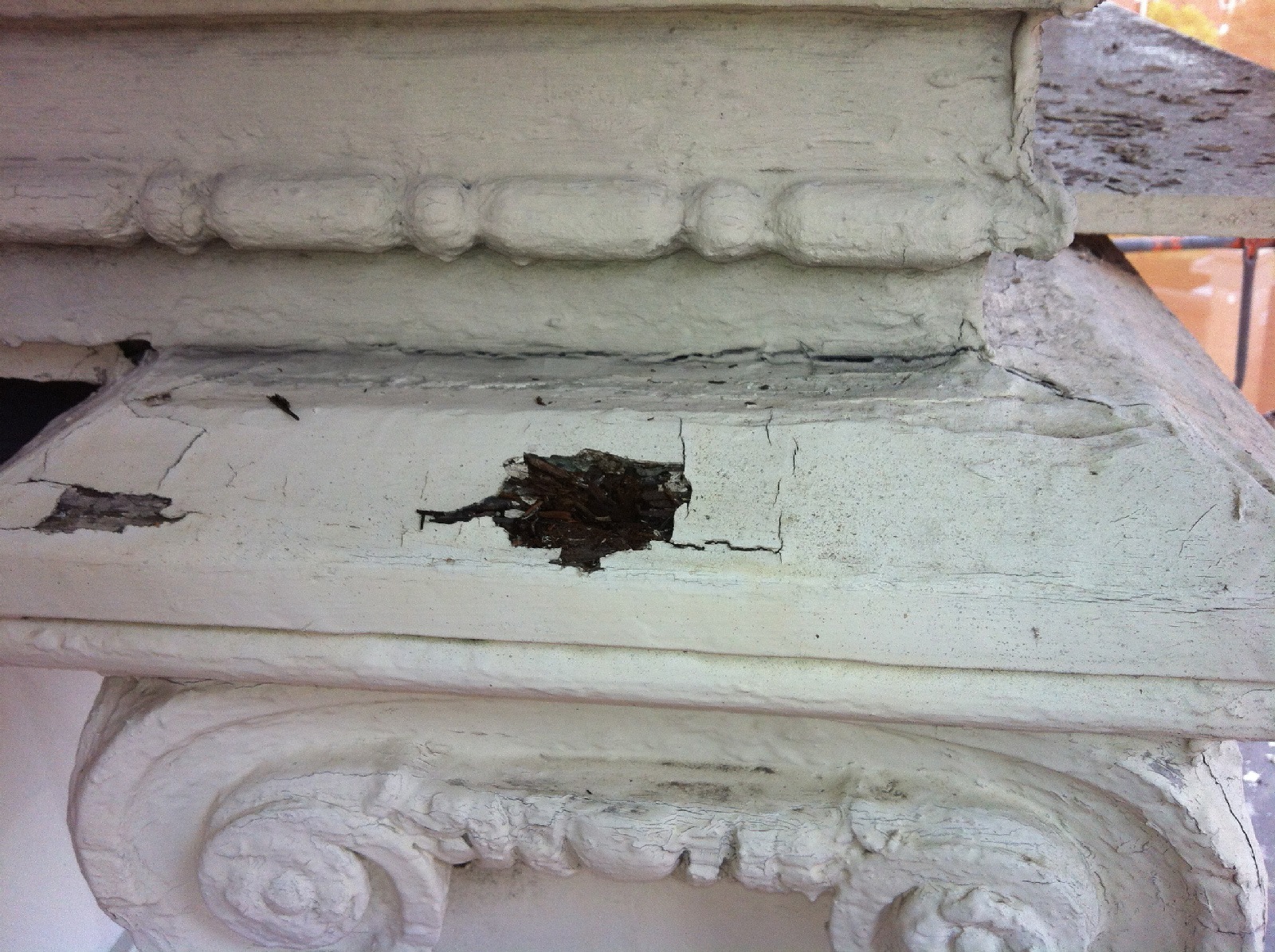 Gedurende eerdere onderhoudscycli waren de gevels meerdere malen overschilderd, wat leidde tot het dichtslibben van ornamenten en verlies van detaillering. In 2012 werd het noodzakelijk om het houtwerk en de gepleisterde gevelelementen volledig te ontdoen van alle verflagen. Deze ingreep bood de mogelijkheid om de oorspronkelijke ornamentale rijkdom van de gevel weer zichtbaar te maken en te herstellen.